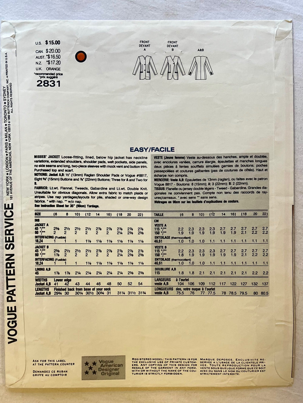 Vogue Calvin Klein 2831 CUT Jacket Size 12