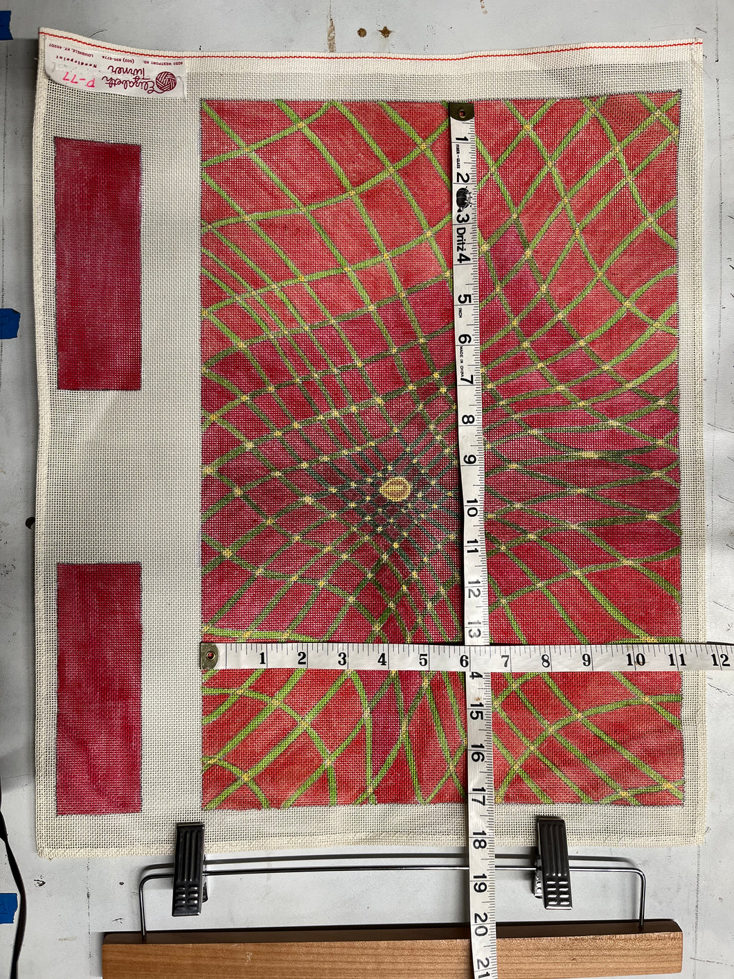 A needlepoint canvas with a geometric pattern predominantly in red and green colors, laid out on a flat surface. hand painted by Elizabeth Turner Louisville, KY, P-77