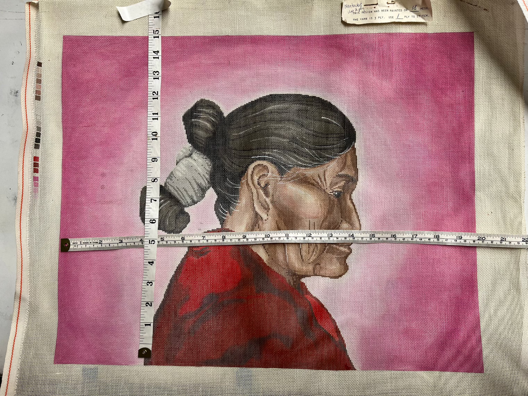 A needlepoint canvas depicting the side profile of an older woman wearing a red garment and a white headpiece, with a pink background.