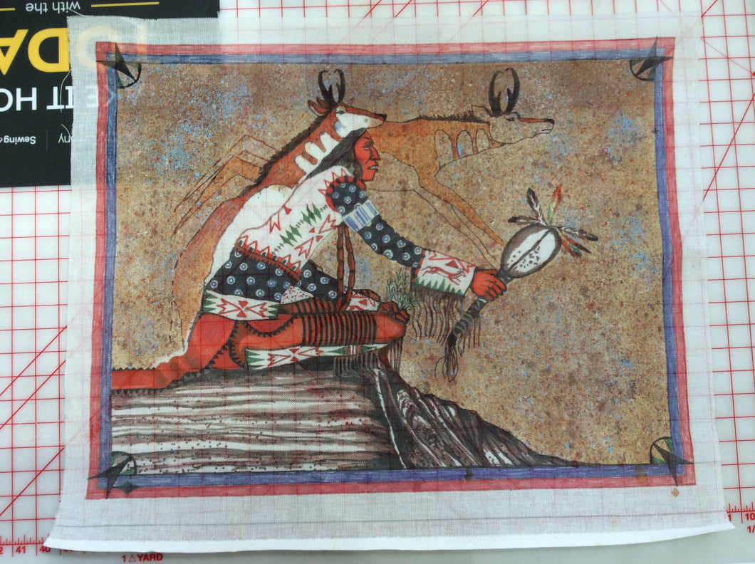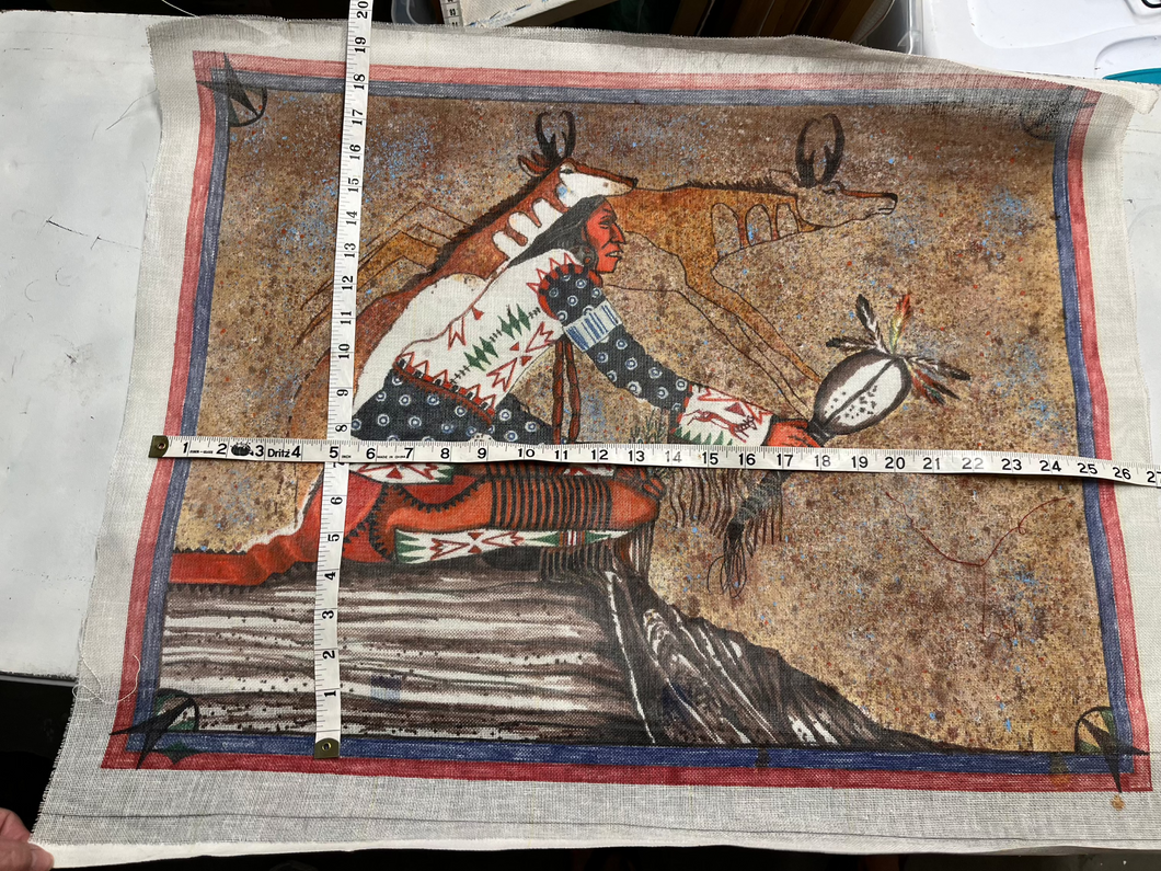 Colorful illustration of a figure with a headdress on a desert tonal background