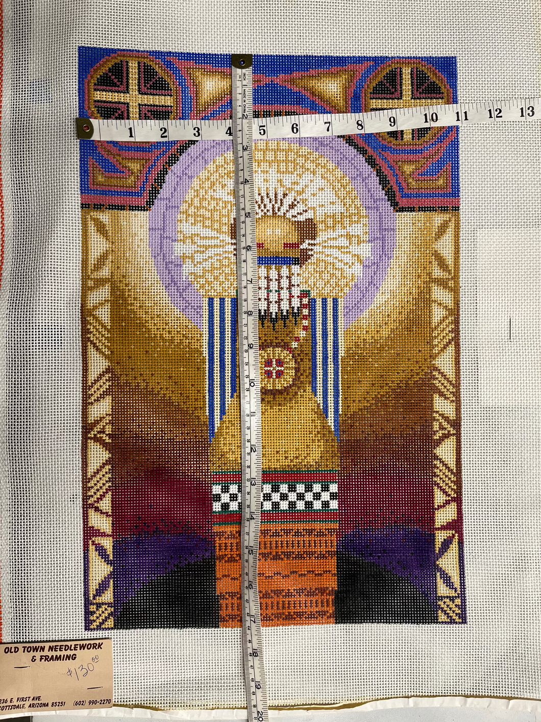 A needlepoint canvas with a geometric and feather pattern primarily in gold, purple, and blue colors, intended for needlepoint project.