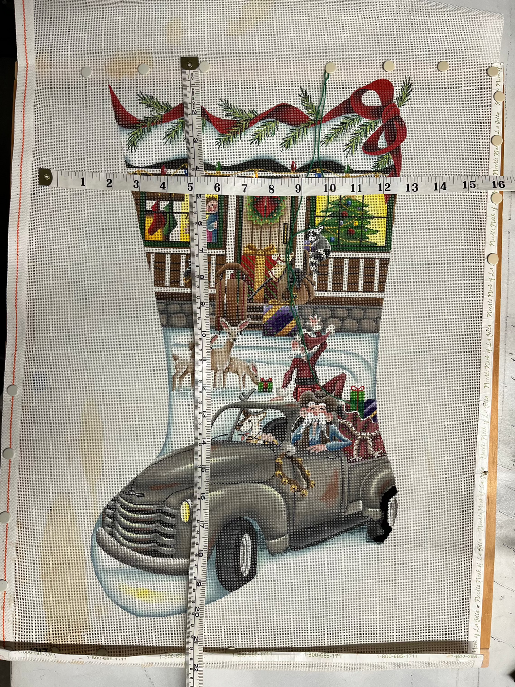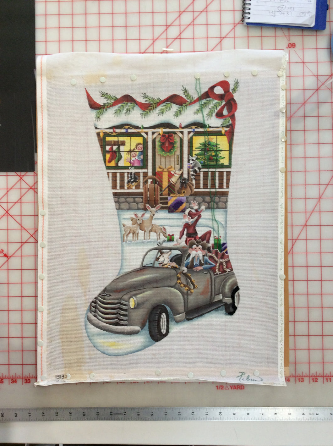 - Orgin La Jolla, " Red track & ski lodge" features Santa Claus in a vintage pick up truck with a sack of presents and a team of Reindeer. produced by Alice Peterson. this piece has a cowboy and pupopy driving the truck. very cute image.