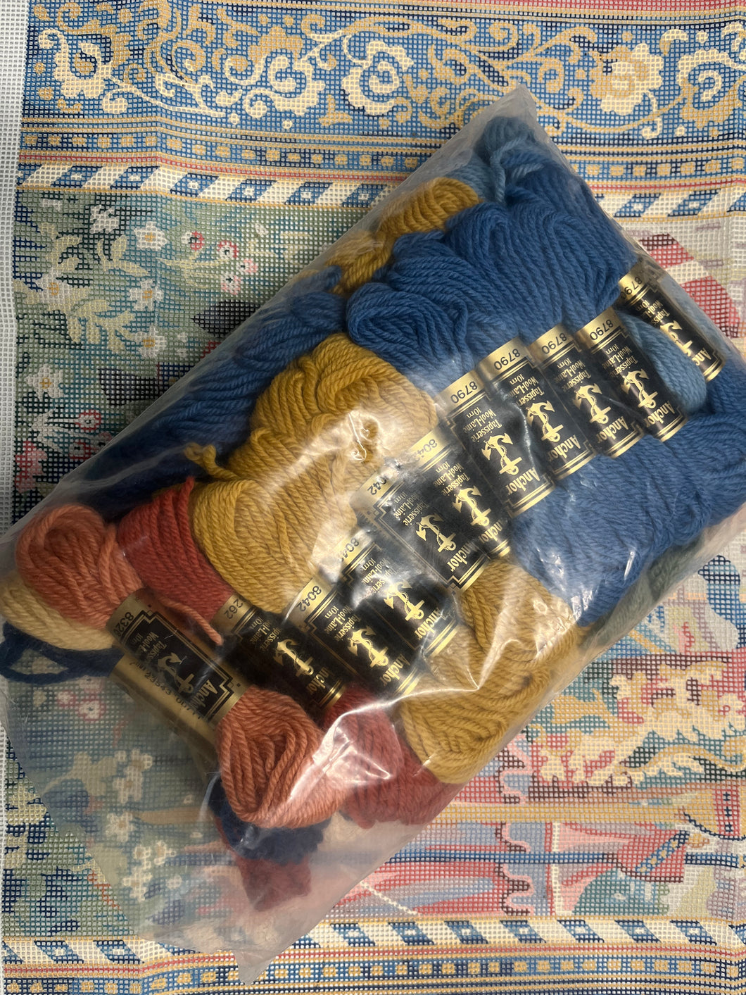 -Yarn included, complete kit with diagrams and instructions and wool yarns. Made in England, 100% cotton canvas, 18 mesh